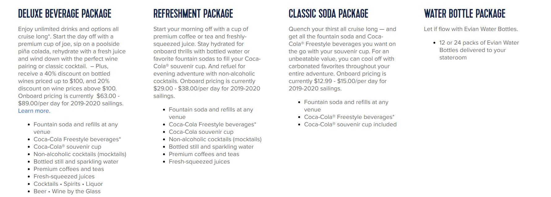 Soda Package: od 15 EUR na osobu a deň (vrátane daní a poplatkov) - zahŕňa bezlimitné množstvo nealkoholických nápojov vo všetkých zariadeniach na palube, plus suvenírový pohár Coca-Cola.