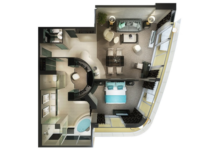 | H3 - The Haven Deluxe Owner's Suite 53 m² / balkón 9 m². 16. paluba - vpredu. Max 4 osoby. Výhody The Haven. | 11 994 € 5 997 € za osobu |