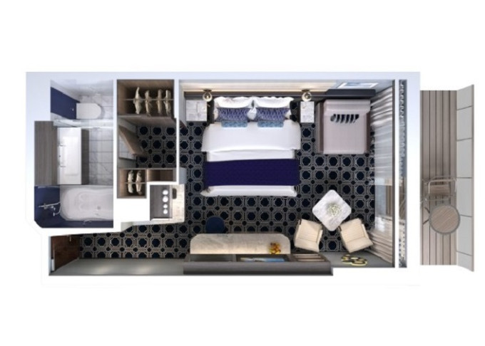 | B6 - Kajuta s veľkým balkónom 31 m² / balkón 14 m². 8. paluba - vpredu. Max 4 osoby. | 8 238 € 4 119 € za osobu | ||