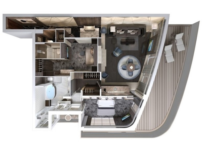 | H2 - The Haven Deluxe Owner's Suite 136 m² / balkón 45 m².18. paluba - vpredu. Max 6 osôb. Výhody The Haven. | 60 352 € 30 176 € za osobu |