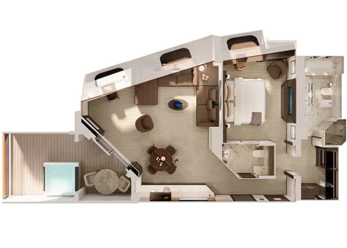 Ocean Residence - Cove Residence s vírivkou Suita + terasa s vírivkou a lehátkami 56 m². Spálňa s obývacou a jedálenskou časťou, šatník. Koktailová súprava, minibar, kávovar, vodná kanvica, ďalekohľad, sejf, kúpeľňa so sprchou. Závesy, svetlo, klimatizácia ovládané smart technológiou. Taška Technogym Case Kit. Fľaša šampanského na privítanie. Maximálna kapacita 3 osoby. 34 872 € 8 718 € za osobu