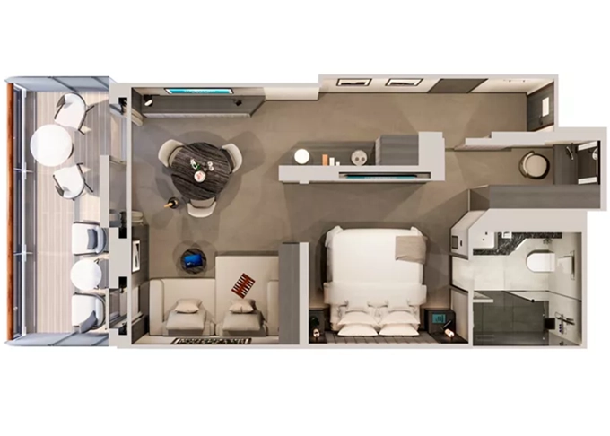 Ocean Residence - Cove Residence Suita + terasa so sedením a lehátkami 56 m². Spálňa s obývacou a jedálenskou časťou, šatník. Koktailová súprava, minibar, kávovar, vodná kanvica, ďalekohľad, sejf, kúpeľňa so sprchou. Závesy, svetlo, klimatizácia ovládané smart technológiou. Taška Technogym Case Kit. Fľaša šampanského na privítanie. Maximálna kapacita 3 osoby. 27 651 € 9 217 € za osobu