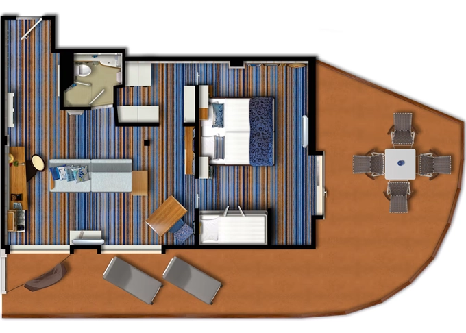 | SUTO - Themen Suite 54 m² + balkón 15 m² so stolom, ležadlom a hojdacou sieťou. Spálňa, obývacia časť, šatník. 10. paluba. Max 4 osoby. Výhody Suite. | 10 816 € 2 704 € za osobu | ||
